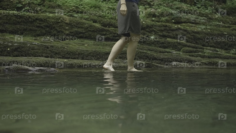Мужчина ходит по воде с каменистым ландшафтом в лесу.Креативно.Женщина идет по воде в естественном пруду в летнем лесу.Женщина на прогулке в диком зеленом лесу
