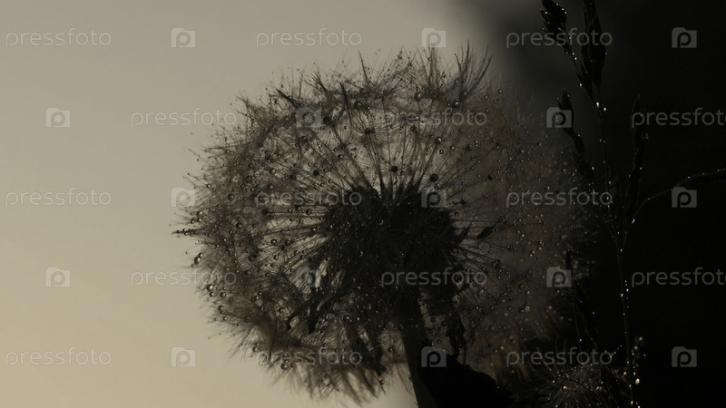 Большие пушистые одуванчики, которые встают после дождя и на них большие капли воды