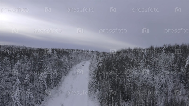 Зима в горном регионе в морозный холодный день, снежная дорога и сосновый лес