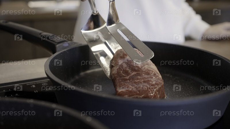 Закрытый женщиной-кухаркой, которая кладет ребра на не липкую сковородку