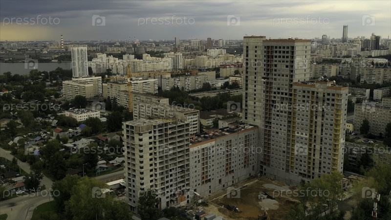 ландшафт дрона. резервные кадры. прекрасный вид на город с высокими домами и большим озером рядом, а также серое небо над головой. высококачественная запись 4k