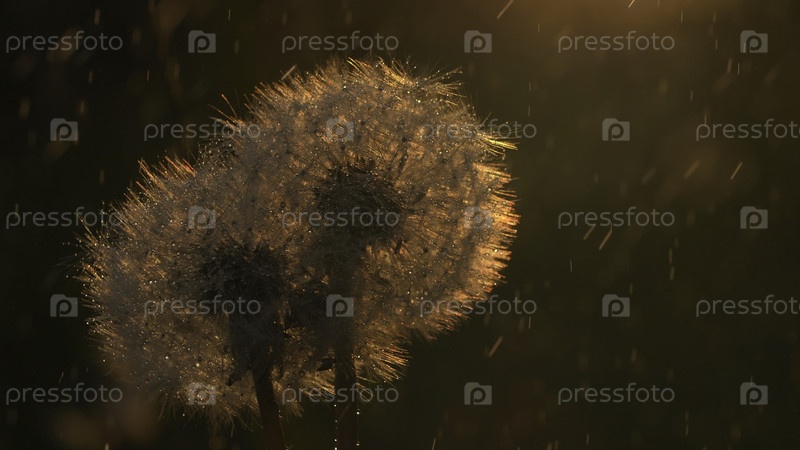 Клубовый снимок одуванчиков в летний дождь с солнцем. креативность. красивые одуванчики в яркий летний дождь. одуванчики со закатами солнечных лучей и дождём