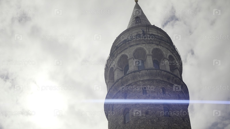 Нижний вид башни на фоне яркого облачного неба