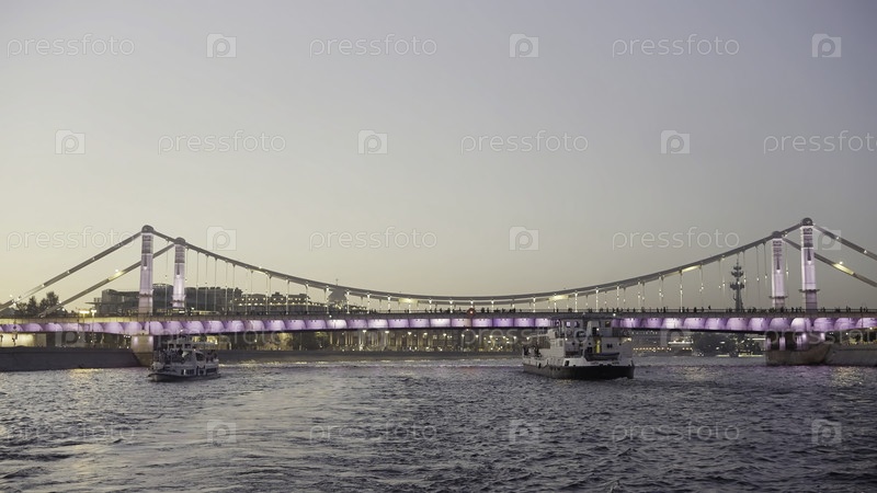 Красивая волнистая река пересечена мостом, украшенным огнями