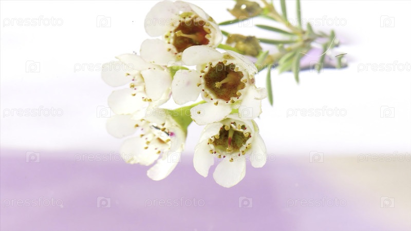 Красивые цветы под водой на белом фоне. Резервные кадры. Нежные цветы спустились в чистую воду. Букет цветов в воде на фоне рябьев поверхности