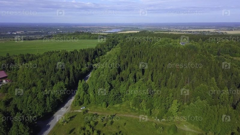 Вид с воздуха на летний красивый зеленый лес и узкую дорогу на фоне голубого неба