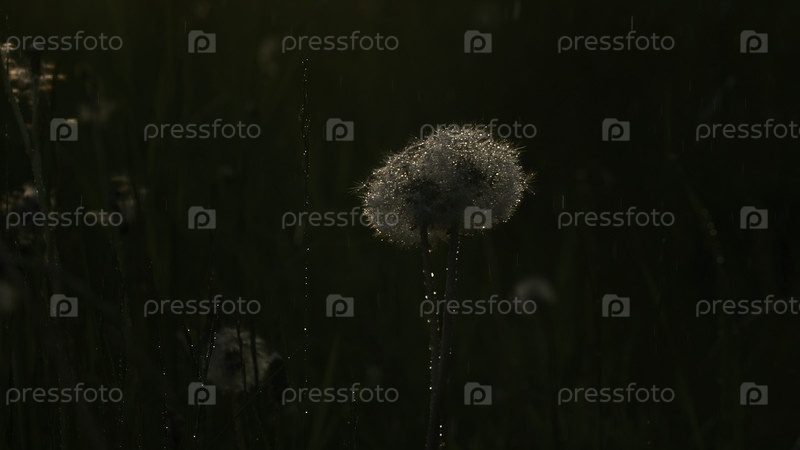 Зеленый фон. Ландшафт в макрофотографии. Креативность. Большие одуванчики с росой и дождем на них. Капельные капли обернули пух цветка, а на заднем плане можно увидеть только зеленую траву и дождь. Высококачественный 4k кадры