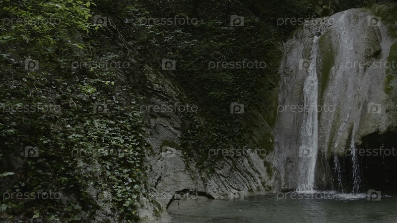 Красивый водопад на скале в джунглях.Креативный.Высокий узкий водопад падает с скалы в джунглях.Природные водопады в зеленых джунглях