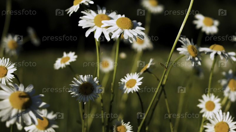 Дейзи, которая греется на солнце.Креативная.Яскравые маленькие цветы с белыми лепестками, которые растут в поле травы и достигают солнца