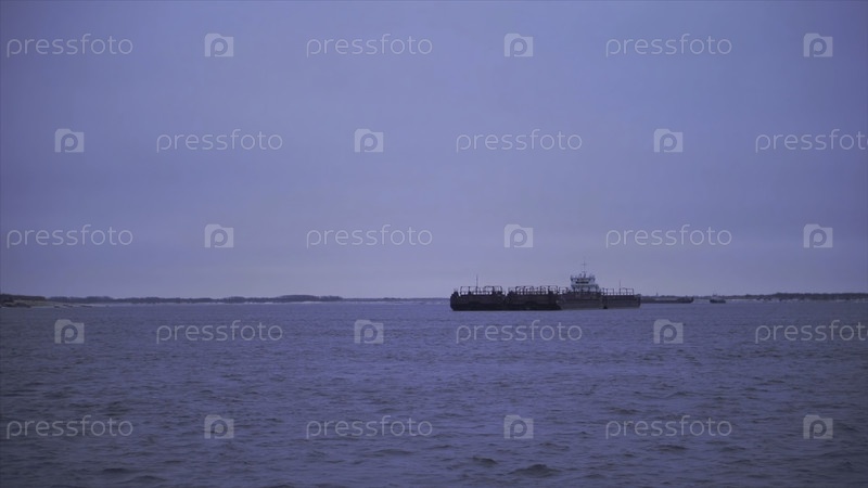 Баржа плывет вниз по реке в пасмурный день, красивый рифмальный пейзаж с плавучим торговым кораблем. баржа пересекает реку в облачный день