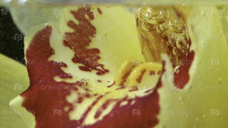 Макро - это вид мягких желтых и красных лепестков летнего цветка. резервные кадры. Красивый естественный рисунок с красивым цветком в чистой воде