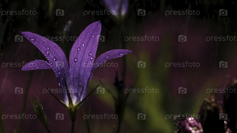 Полив голубых колоколов. Творчество. Вода опрыскивает красивые цветы синего колокола. Полив садовых цветков в солнечный летний день