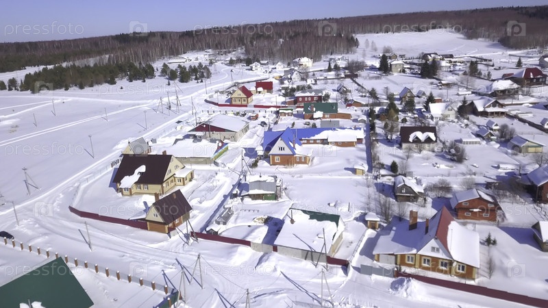Зимние леса, где видны маленькие дома деревни и большие снежные заносы и голубое небо и большие длинные зеленые деревья под снегом