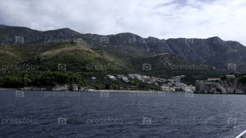 Вид с яхты на зеленые тропические холмы и облачное небо.Креативно.Увлекательная морская поверхность и зелёное побережье с растущими деревьями и растениями