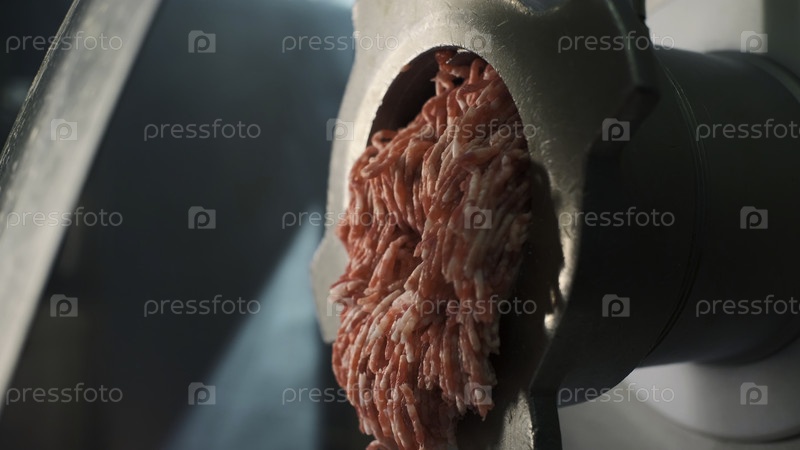 Близкий план измельченного мяса, выпадающего из мясной мельницы. Клип. Приготовление свежего сырого фаршированного молока, прокрученного через фаршу. Шахтёр с потоком начинки