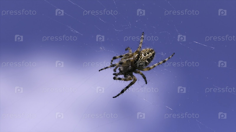 Дикий хищный паук в интернете. творческий. большой паук в сети против голубого неба. паук сидит в сети на летнем лугу