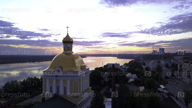 Красивый вид на город.Интересный пейзаж, где можно увидеть нежное розовое небо, церкви и различные дома, а также долгую спокойную реку.Высококачественная запись 4k