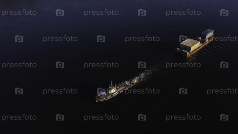 Вид с воздуха судоходной баржи, перевозящей грузы вверх по реке Миссисипи на границе Миссури и Иллинойса