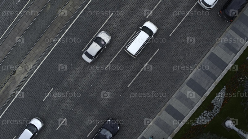 Вид на городскую дорогу с движением автомобилей. Резервные кадры. Городская магистраль с перемещением машин и людей. Автомобили ездят по городским дорогам в пасмурный день
