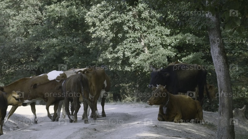 Коровы на пыльной дороге возле леса в деревне в солнечный день.Креативное.Пейзаж с животными на дороге