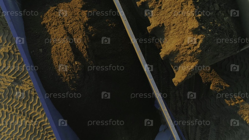 Экскаватор убирает песок в самосвалу. Сцена. Вид сверху экскаватара, загружающего песок в грузовик. Строительные и шлифовочные работы с песком