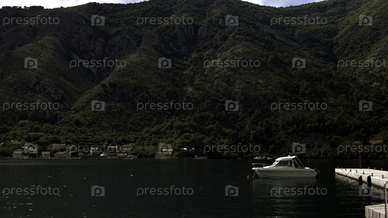 Впечатляющий природный фон с привязанной маленькой яхтой недалеко от пирса.Креативно.Горки и большое бирюзовое озеро
