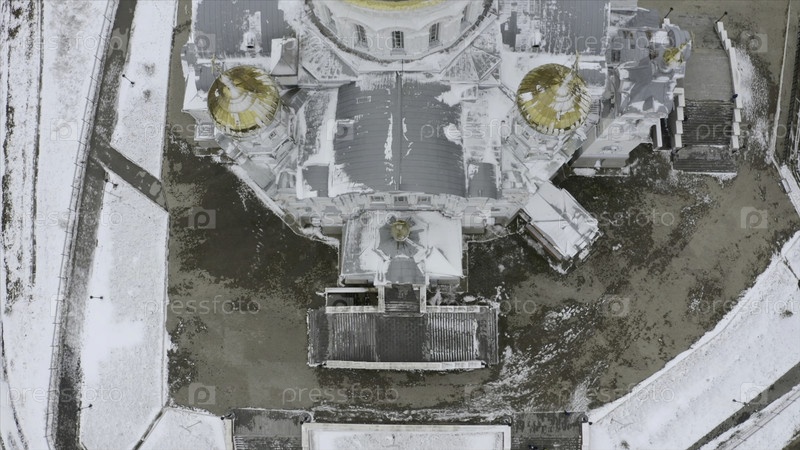 Вид на белую церковь в снегу зимой. Красивая церковь со золотыми куполами в снеге в зимний день. Заснеженная крыша церкви с куполами зимой