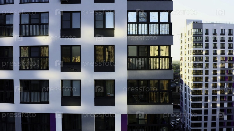 Темные окна белого многоэтажного здания. резервная запись. вид на жилые небоскребы в солнечный летний день