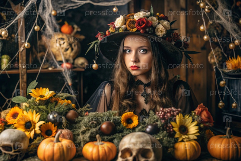 Концепция Хэллоуина. Ужасное. Костюмированная вечеринка. Красивая женщина в костюме ведьмы. Баннер, открытка