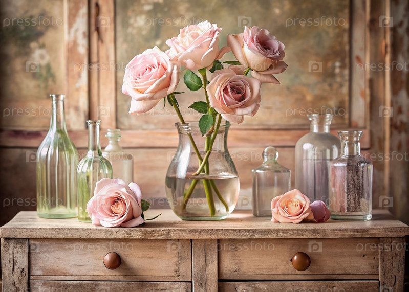 Красивые розы в стеклянных вазах и флаконах на древнем деревянном шкафчике Букет цветов в вазе в интерьере дома Светлый, бежевый, розовый цветочный фон