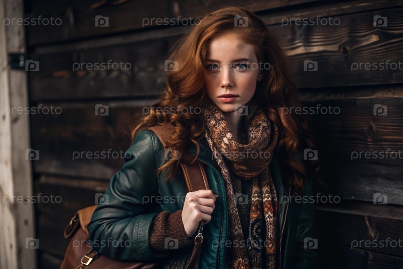 Осенний портрет. Близкий план молодой рыжеволосой женщины с выразительными зелеными глазами в коричневом кожаном куртке и бирюзовом шарфе