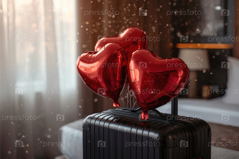 Балонный чемодан в форме сердца в гостиничном номере, чтобы отпраздновать День святого Валентина.Романтический праздник для двух любовников, действие 14 февраля