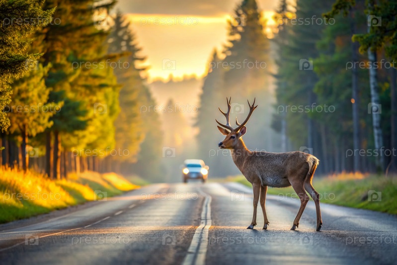 ДТП.Животное - это олень на дороге возле леса рано утром.Дорожные опасности, дикая природа и транспортное средство