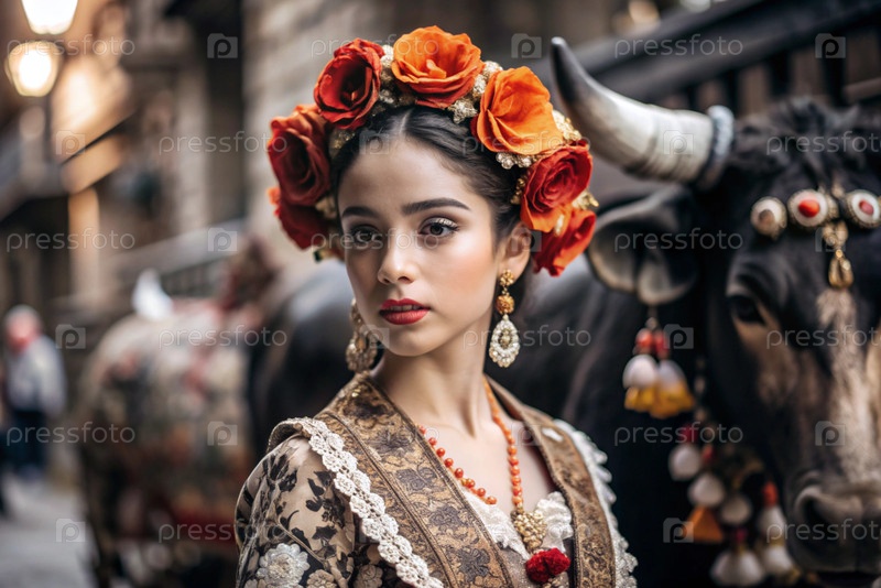 Испанская девушка в традиционном испанском национальном костюме. Перед быком. Бикоборство. Портрет символизирует традиции и культуру народа Испании