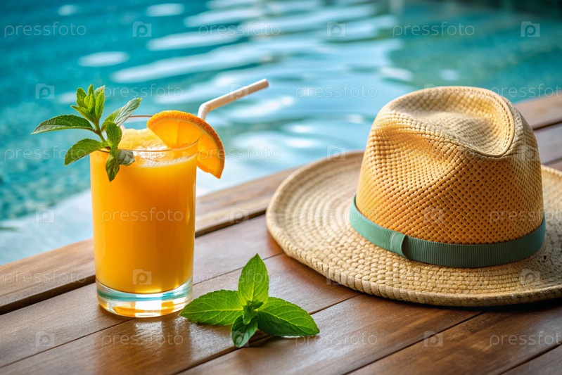Стакан вкусного свежевыжатого апельсинового сока на фоне бассейна.Свежий апельсиновый сок с апельсином, кубиками льда и мятой
