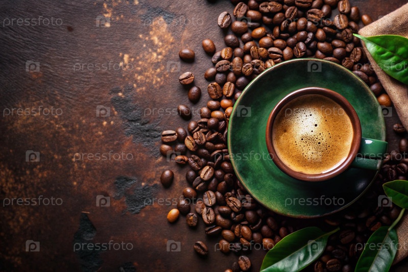 Чашка освежающего черного кофе и кофейных зерен на старом зеленом столе