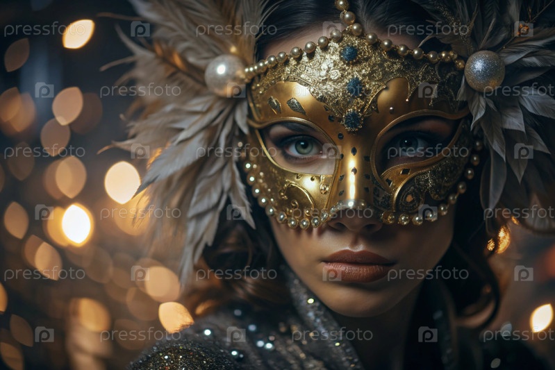 Карнавал Венеции.Закрытие женщины в украшенной карнавальной маске.Яркие цвета передают атмосферу празднования и роскоши
