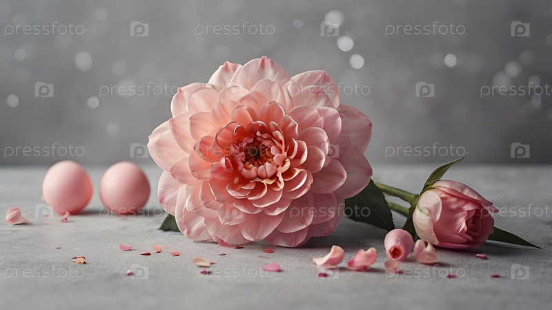 Минимализм. Красивый светло-розовый цветок на сером фоне. Концепция Дня святого Валентина, Дня матери и женского дня. Копия текстового пробела