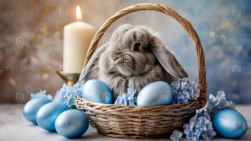 Нежные пасхальные яйца, серый кролик и голубые цветы гортензии на пастельном акварельном фоне с нежными венами