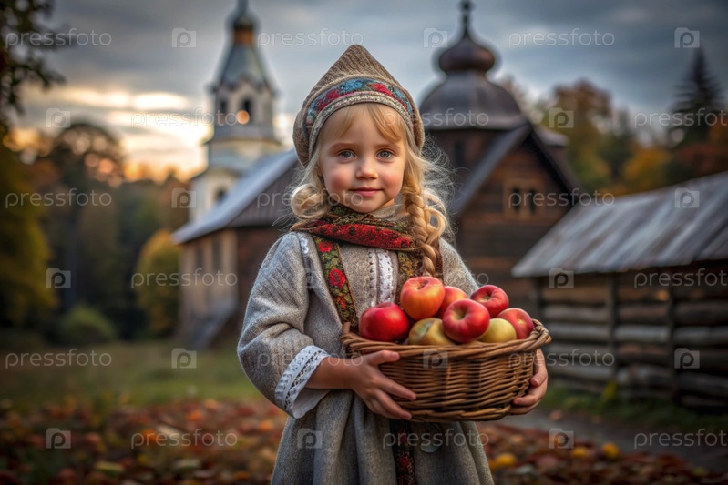 Красивая девушка в русской национальной одежде с корзиной спелых красных яблок на фоне православного храма
