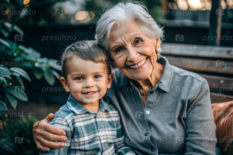 Счастливая семья, ребенок и бабушка обнимаются на улице в парке, счастливы и довольны
