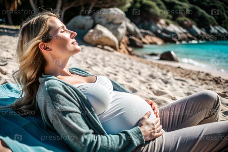 Расслабление, спокойствие, морской воздух. Закрытие живота. Беременная женщина на пляже у моря. Концепция беременности, родов и родительских обязанностей