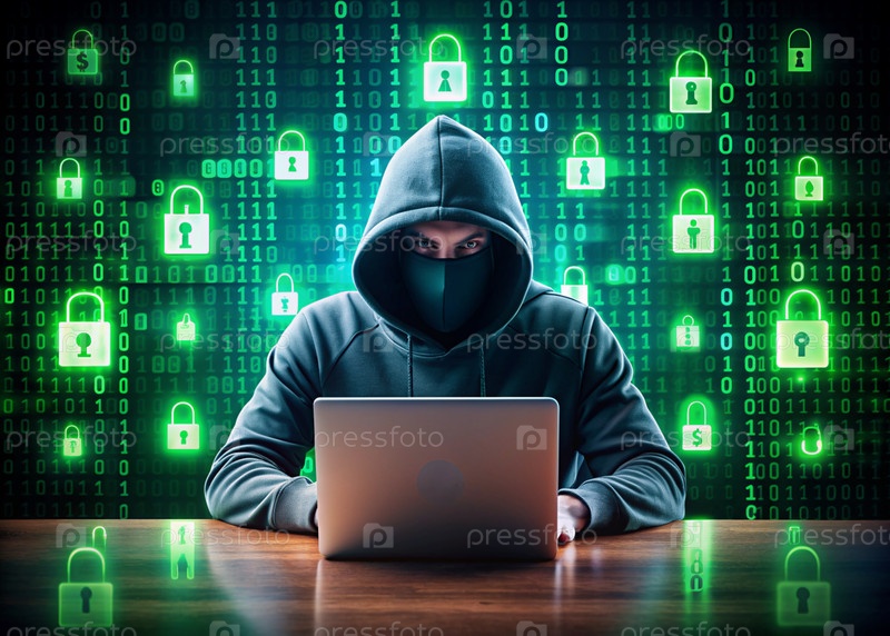 Хакер работает на ноутбуке, цифровые коды на виртуальном фоне. взлом и защита онлайн-данных. цифровые технологии, разработка программного обеспечения