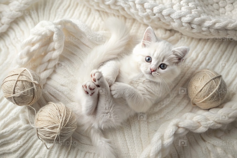 Животные. маленький пушистый белый котенок играет с шариком пряжи на белой кровати. любопытный кот лежит на белом одеяле и смотрит в камеру. текстиль, вязание