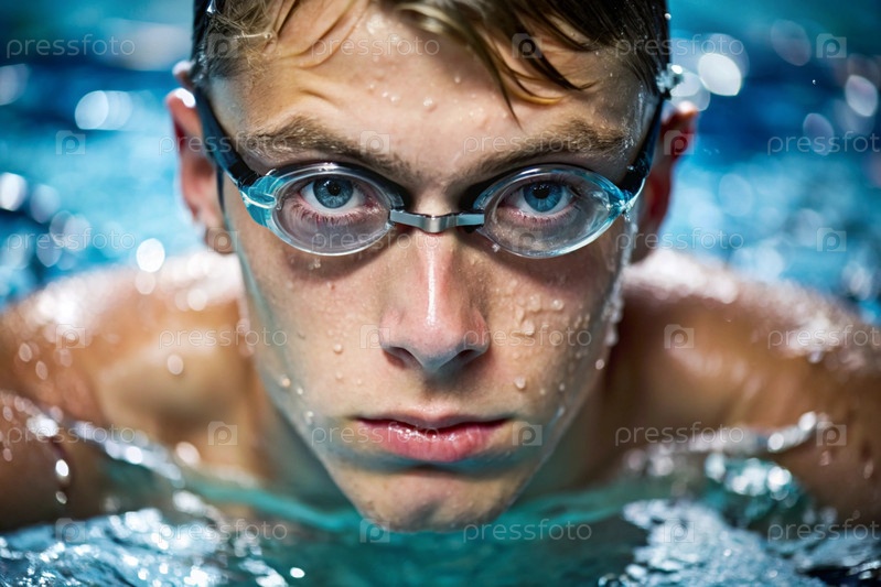 Спортивное плавание. Мужчины-плаватели. Спортсмен с очками в бассейне во время соревнований на близком расстоянии. Человек смотрит на камеру