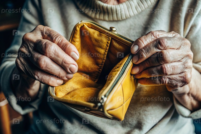 Бедность, проблемы с пенсией. Пожилой пенсионер держит пустой кошелек. Последние деньги, трудности. Семейный бюджет малоимущих
