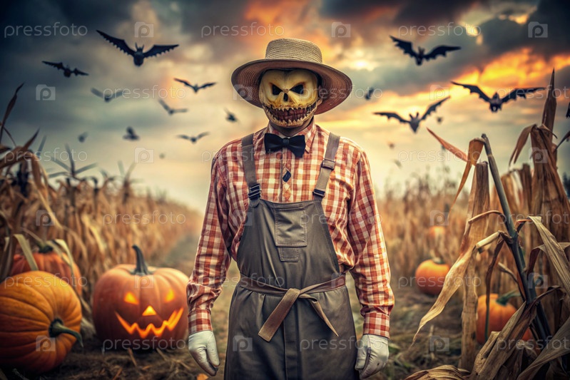 Концепция Хэллоуина. Ужасная. Страх. Устрашающий богий с тыквенной головой, квадратной рубашкой и бабочкой. Баннер, открытка