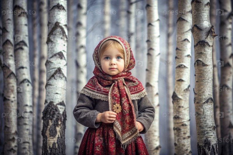 Русские народные традиции.Русский аромат.Красивая девочка в национальном русском платье и шарфе в красивом березовом роще.Портрет прекрасной девушки в березном лесу