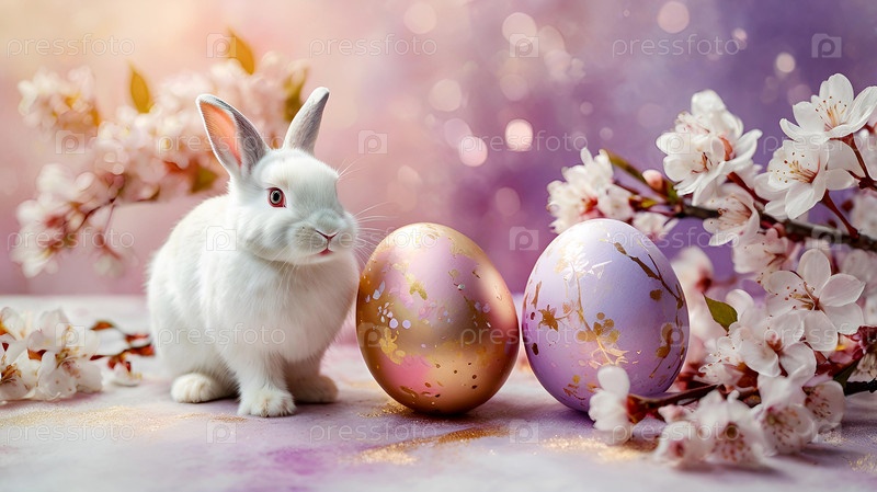 Нежные пасхальные яйца, белый кролик и вишневые ветви на фоне пастельного акварели с нежными полосками