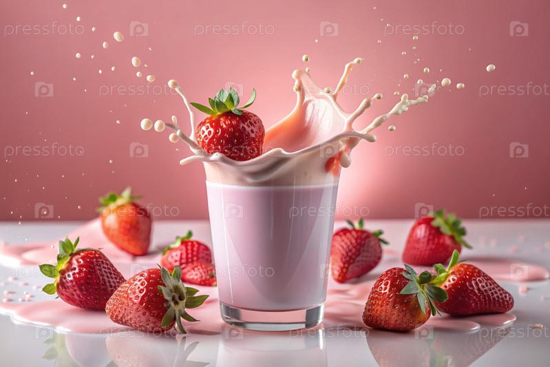 Творческий кулинарный рисунок. ближайшее наполнение клубники, клубника в стакане молока, розовый милкшейк, коктейль йогурта с жидкими каплями на розовом фоне